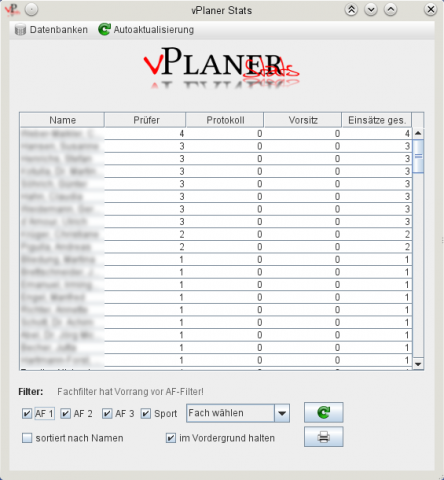 Das Zusatzmodul vPlaner - Stats verschafft Ihnen einen Überblick über die Anzahl der Einsätze Ihrer Lehrkräfte (Prüfer, Vorsitz, Protokollant) bei den verschiedenen Prüfungsarten (mündliche Prüfungen oder Präsentationsprüfungen). Sie können so die Einsätze gleichmäßiger verteilen.
