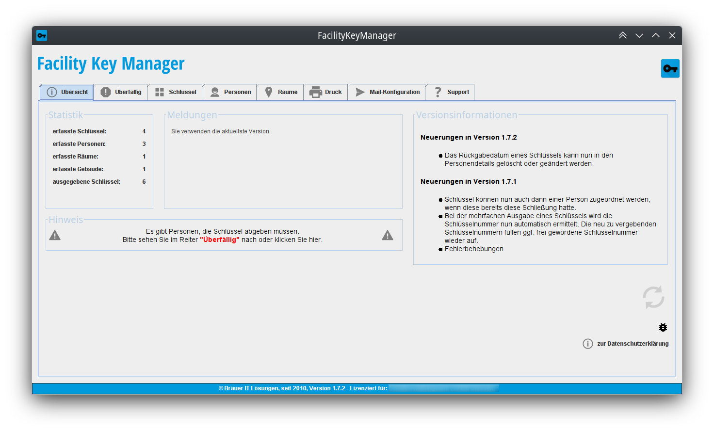 Sie können damit Personen, Räume, Häuse und natürlich auch Schlüssel erfassen. Das besondere ist, dass Sie jedem Schlüssel ein Datum zuordnen können, wann dieser wieder abgegeben werden muss. Sie werden dann automatisch benachrichtigt und können auf Wunsch direkt ein halbautomatisches Email als Erinnerung versenden lassen. Ideal für Angestellte, die nur befristet bei Ihnen sind.